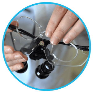 倍率2.5倍と3.5倍、焦点距離25~55センチメートルのガラスレンズ。双眼レンズを使用すると、患者にそれほど近づく必要はなくなります。
